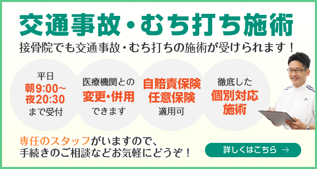 安城接骨院ではケガに対する治療はもちろんのこと、交通事故の治療にも力を入れておられます。交通事故の治療には技術だけでなく、保険の知識や法律の知識が不可欠です。
