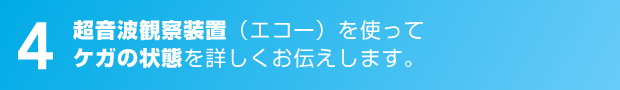 症状に合わせて超音波観察装置(エコー)を用いてケガの状況を確認しながら治療を進めるため、無駄なく適切に治療を進めることが出来ます。