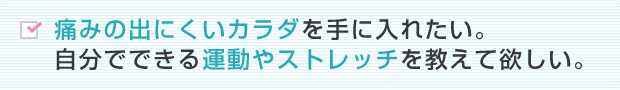 痛みの出にくい動作の仕方、改善のための運動やストレッチを無理のない範囲でアドバイス致します。