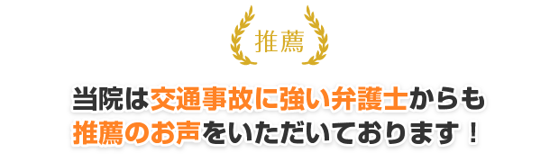 交通事故に精通している弁護士とも提携をしていますので、慣れない交通事故で心と体に不安を抱えていらっしゃる方にもご安心いただけます。現在他院にご通院中の方でもお気軽にご相談ください。