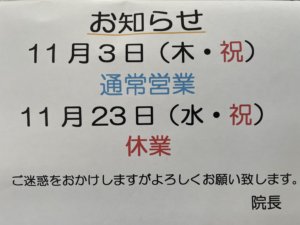 11月の祝日営業のお知らせです。